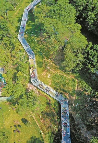 市民游客在越秀区花果山的云道徒步。