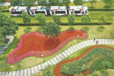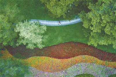 在二沙岛绿道上散步的游人途经波浪状的美丽花景。