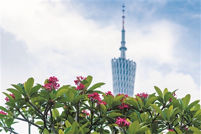海心沙绽放的鸡蛋花与广州塔相互辉映。