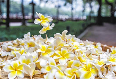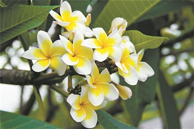 广州街头常见的鸡蛋花以白色为底,中间点缀着一抹鹅黄。它没有其它鲜花艳丽,却分外飘香。