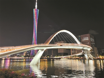 亮灯后的珠江两岸人行桥与广州塔交相辉映