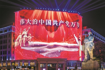 海珠广场大屏幕的七一主题灯光秀 。