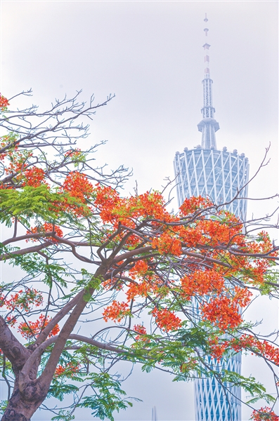 广州塔与绽放的凤凰花组成一幅风景画。