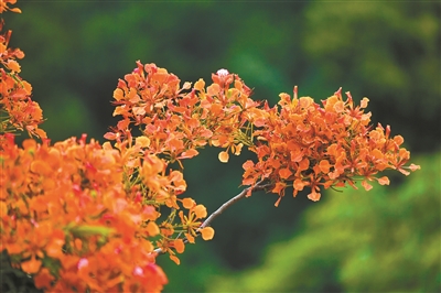 凤凰木又称金凤花、红花楹树,是广州常见的观赏树种。叶细小,“如飞凰之羽”,花夺目,“若丹凤之冠”。4月中开始,广州凤凰木开始进入花期,从广州白云大道北、海印桥头、东山湖公园、烈士陵园、南沙蕉门公园等,再到各大校园,随处可见凤凰木的身影。