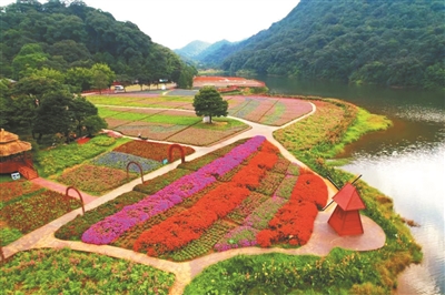 在石门国家森林公园,海拔约800米的天池湖畔,花海绵延。16000平方米花田上用千日红、千日粉、鸡冠花,醉蝶花、孔雀草、鼠尾草等花卉布置成花海。主景部分设计为“石门国家森林公园标识”的形象,寓意石门风光无限好。