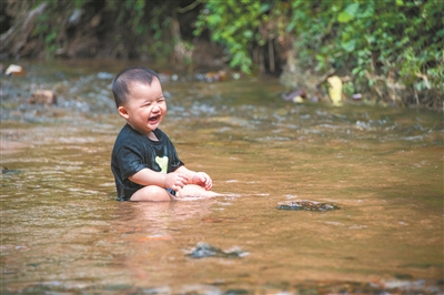 大源村的一位小朋友在清澈的沙坑涌里愉快戏水。