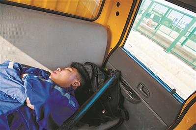工作一天的曾海下午收工后,疲倦地睡着了