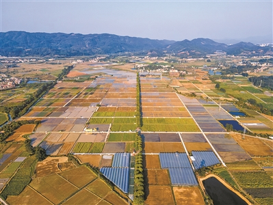 鸟瞰增城区丝苗米现代农业产业园的科旺丝苗米种植基地,农人已将农田犁好,田园呈现出一派欣欣向荣的景象