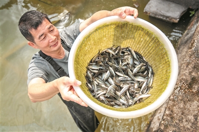 花都区花山镇一甲鱼养殖场,农人将鲮鱼苗投放到甲鱼塘