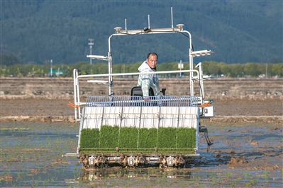 增城区丝苗米现代农业产业园的科旺丝苗米种植基地,农人正采用机器插秧