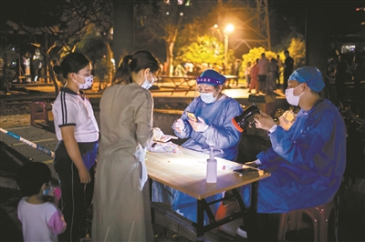 3月15日夜晚,海珠区穗花新村,由于排队的人较多,防疫人员临时加开了一条通道做核酸检测,他们手持灯光查看市民的信息。