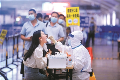 3月15日夜间,广州南站一楼中央大厅,防疫工作人员为抵穗旅客进行核酸采样。