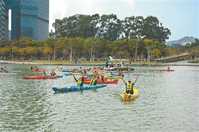 市民在蕉门河上划皮艇。