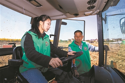 沈笑芬正在请教驾驶农机的问题,她的驾驶技术都来自于父亲。