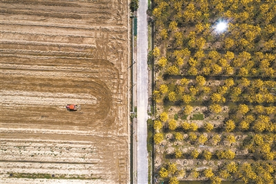 春耕开始,沈笑芬驾驶拖拉机在农地上犁地松土。一旁种植的黄花风铃木已开满了黄花,农田里开始有了春的气息。
