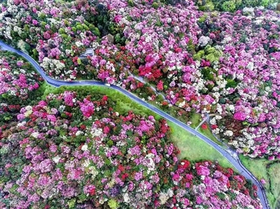 此外,总落差达40米的三叠瀑布、天生桥、花底岩等千姿百态的岩溶奇观,以观山、戏水、游村、探洞为一体的米底河景区,集花卉观光采摘、产品加工、育苗科普、酿酒体验为一体的花田酒肆景区,以紫薇奇观为主题的千年紫薇王景区等景区景点形成了多样化的旅游体验,令“杜鹃王国”的体验更加多元化。花间阡陌,诗意画卷在此展开……