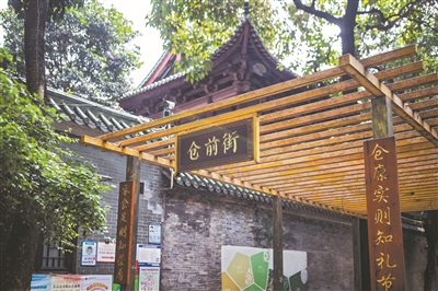初夏时节,记者漫步仓前街,街口藤架上爬满植物,书有“仓前街”三个字的牌匾悬在藤架中间,两块竖匾分列两旁,上书《管子·牧民》中的名句:“仓廪实则知礼节,衣食足则知荣辱。”有老街坊告诉记者:“这里已经没有谷仓了,我记事起就只有这条麻石路。”记者看到,脚下路面由四块麻石并列铺成,见证了当年的运粮景象。