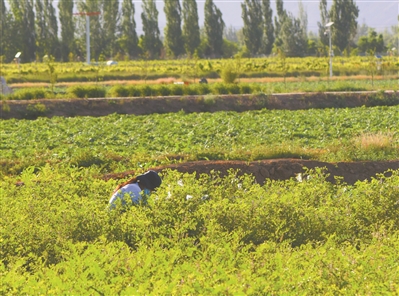 研究人员在甘草地进行研究工作
