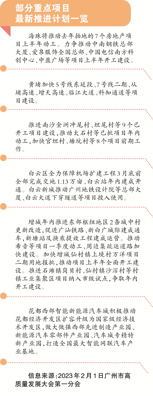 重大项目建设是加快产业提质升级、实现高质量发展的重要抓手。因此,全省、全市高质量发展大会之后,广州第一时间就启动了一季度重大项目签约开工活动。超460多个项目陆续开工、签约,涉及智能制造、数字经济、高端金融、文化创意、重大基建等领域。这些创新能力、行业带动能力强的重大项目陆续开工、投产,将为提升城市能级量级、加快推动高质量发展提供强劲动力。值得关注的是,除了产业布局升级,还有黄埔沙步、黄登旧村改造安置区工程等22个城市更新领域的项目开工建设,总投资764亿元。