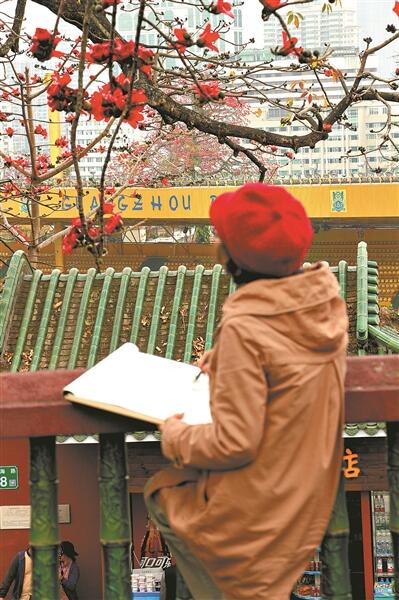 木棉花开,市民来到户外写生。