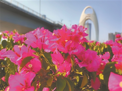 “三季有花,四季常青”,种植于广州市区351座天桥,中心城区天桥变身为空中花廊。蓝天白云下,蜿蜒于高楼间的高架桥上的簕杜鹃争相绽放,紫色、红色等颜色搭配的花道,仿佛给高架桥描上了漂亮的花边,形成一道道蜿蜒穿行的靓丽的彩虹飞架,让冰冷的钢筋水泥桥变身为美丽“空中花廊”。市民和游客经过,仿佛置身灿烂的云霞中,身心愉悦。