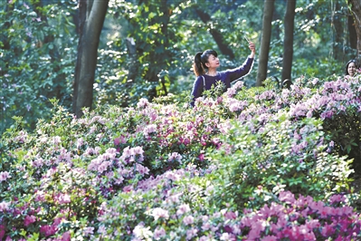 在麓湖公园鸿鹄山上,杜鹃花也开得一片灿烂。漫山遍野,千姿百态,登顶路上一路繁花相伴。花的颜色从大红到嫩粉,每种色调又从深到浅,争奇斗艳,形成花海景观。目前正是杜鹃花盛开时节,沿路可看到鲜花怒放,一团团、一簇簇织就了一幅“万绿丛中片片红,春风花草处处香”的春日胜景。登高远眺,广州美景尽在脚下,山间各色杜鹃花花团锦簇,吸引了不少市民游客前来游览赏花。麓湖公园和广州市林业和园林科学研究院的技术团队用了两年的时间,精心设计并科学挑选优良品种,在鸿鹄山种植了5500多株杜鹃。