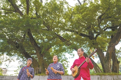 现场,洪运妹又即兴唱起客家山歌《油菜花盛开的时候》,“油菜花盛开的时候,春天在王子山停留。花海里蜂蝶飞舞小鸟歌唱,暖洋洋的风缓缓吹进心头……”伴随着“啪啪啪”节奏轻快的快板打击声,一个个嘹亮清脆的字符不断传开,吸引了附近的村民聚集过来,饶有兴致地聆听这朴素浓情的歌声。微风吹过,古榕树的叶子微微颤动,发出“沙沙”声音,仿佛是轻轻和声伴奏,一幅人与树和谐共生、你唱我和的温馨场景在这里得到生动诠释。只闻余音袅袅在大树四周不断回旋,不绝如缕。
