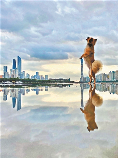 在广州市海珠区海印公园的亲水平台,有不少市民带着“毛孩子”来岸边戏水,感受夏日清凉。江面视野开阔,远处的广州塔、东塔、西塔清晰可见,绵延的建筑群勾勒出城市天际线。以城市楼宇为背景,压低机位,巧借地面积水的反光,把萌宠日常的游戏定格,一幕幕以蓝天、珠水为背景的亲情大戏就此上演。