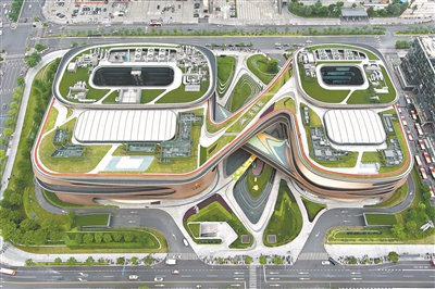 天环广场的网状屋面钢结构表皮形似双鱼,造型整体覆盖建筑立面及屋架,形成一体化设计效果,极具视觉冲击力。