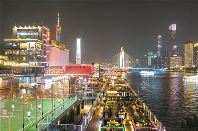 位于珠江边的琶醍是广州知名的啤酒文化创意艺术区,它由原珠江啤酒厂的码头、厂区等设施改造而成。在改造的过程中,注重景观设计和空间创新,将工业元素与现代设计相结合,创造出独特的城市景观。尤其是沿江边伸展的超长超宽的天台,拥有优美的江景视野,提供了结合餐饮、文化、音乐、运动和潮流的综合性消费体验,是年轻人夜间消费和社交的热门场所。