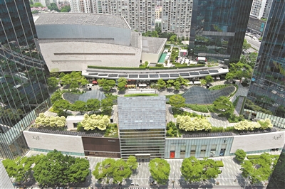 太古汇的天台通过屋面绿化、造型设计和对梯屋设备进行有效遮罩,整体大方时尚。