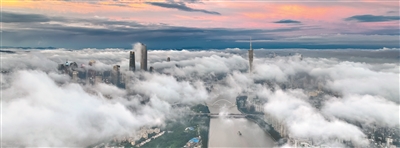 夏日的广州雨水充沛,大雨过后,天边出现壮美的晚霞,羊城掩隐在云雾中,宛若仙境。