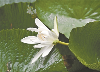 晓港公园,碧绿的池塘里,白色的莲花悄然绽放。