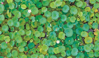 荔湾湖公园,从高空俯瞰荷花池,数朵荷花从满眼碧绿中冒了出来。