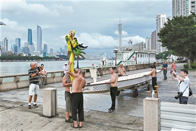 6月14日,滨江东路游艇会码头,工人们将龙头安装在龙舟之上,为即将到来的广州国际龙舟邀请赛做精心准备。