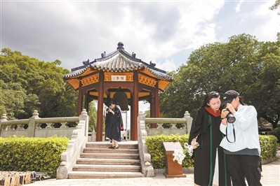 6月23日,中山大学,毕业生和家人在阳光下拍摄毕业照。