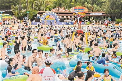 时值暑假,广州长隆水上乐园人气直升,造浪池内人头攒动。