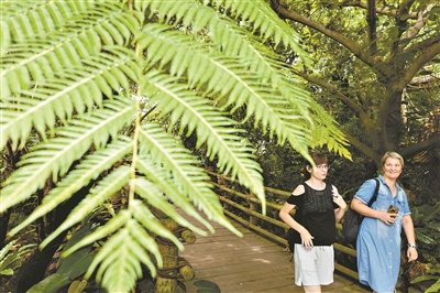 外国游客来到华南国家植物园避暑、欣赏来自世界各地的植物、体验热带雨林景观。