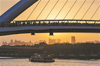 8月的傍晚,高温艳阳的一天迎来了暑气渐消的时刻,从珠江南岸望去,太阳像一颗金色的蛋黄,余晖给整个广州披上了一层金色。全长488米的海心桥上,来自五湖四海的游客不约而同地举起手机记录这金灿灿的时刻。作为广州第一条跨珠江人行桥,海心桥是不少外地游客来广州旅游的首站,上桥的游客大排长龙。