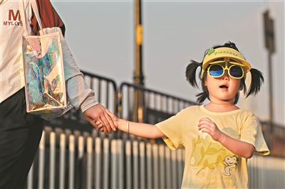 珠江边,孩子戴着遮阳帽和墨镜随大人出游。