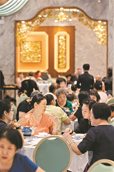 不少游客来到四大园林酒家之一的南园酒家喝茶、打卡,品尝广州美食。