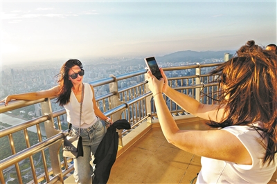 外国游客在广州塔登高赏景。