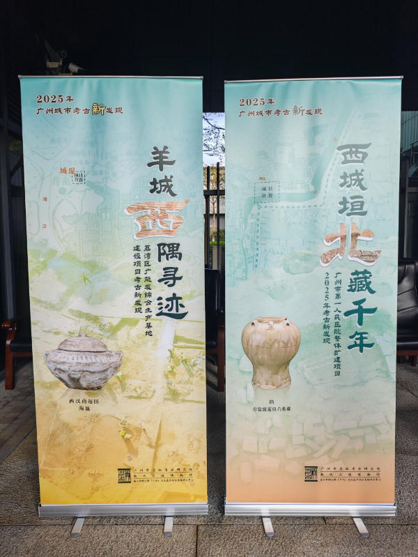 广州市第一人民医院整体扩建项目位于“广州古城至珠江北岸”地下文物埋藏区范围内。2014年在医院磐松楼2号楼发现了宋、明清时期城墙遗址,2022年4月至2025年8月在东风西路医院北部的高岗遗址发现了西汉南越国至唐宋时期的排水沟、水井、灰坑、灰沟等生活遗迹,西汉至隋唐时期墓葬以及清代城壕护堤及埠头。2025年,医院配合广州市第一人民医院整体扩建项目开展了第5、6次考古发掘。其中项目北区清理了西汉南越国时期至宋代灰坑、水井、墓葬等各类遗迹约900处,出土陶瓷器等各类文物约1000件(套),显示遗址各时期皆存在较高等级的建筑,其性质在墓地与生活居址间多次转变。南区的JPG2发现了宋至民国时期护城河河道及其堤岸遗迹,与文献中宋代筑西城、开西濠,而明代“因旧浚濠”等记载相符;JPG1揭露了长约125米的护坡墙(Q1),使用大陶罐、麻石与青砖分段砌筑。结合墙体中镶嵌的2块题记石碑,以及出土的青花带字瓷盘,判断Q1应为城西方便医院于民国六年(1917年)修筑,是该院保存的一处较为完整的历史遗迹。此次发掘对研究西汉南越国至民国时期广州西北部区域的城市发展历程、历史地理与水脉变迁具有重要意义。