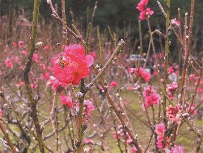 今年春节之际,番禺洛浦岛,桃花正艳,引来了蜜蜂。