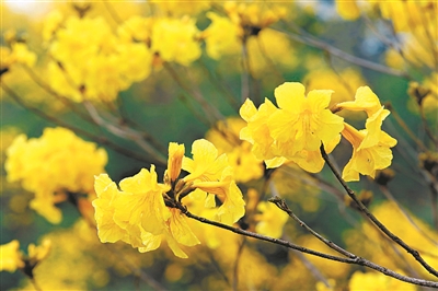 三月天,临江大道观“风铃”。临江大道上黄花风铃木满枝头挂满金黄色的花朵, 是当月的“花仙子”。