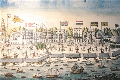 清代广州十三行商馆区毗邻珠江,江面上舟楫往来,十分繁忙
