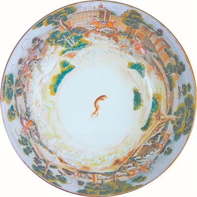 闻名欧洲的广彩文物珍品《猎狐纹调酒大碗》,直径达40.4厘米。碗内壁一圈满画着一幅西洋人猎狐全景图。图中贵族们正策马飞驰,一只跳跃奔跑的狐狸绘在碗底中间,这是模仿一幅油画绘成的。但是图中所采用的环形散点透视法跟中国长卷画的散点透视法是出于一样的原理。由此可见,碗里美丽完满的图案,是广彩的加彩高手经过对原画构图的再创作绘制而成的。