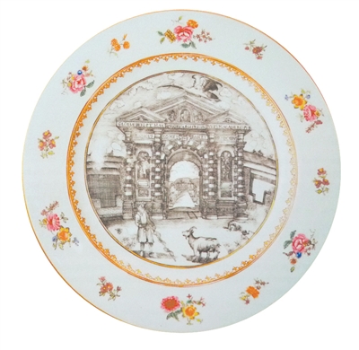 约在1765年,广彩匠师制作过一件描绘英国牛津波塔尼卡尔公园大门的瓷盘,门前站着和山羊一起散步的德国植物学家波巴尔脱。这是荷兰铜版画家伯尔格赫尔斯的作品,由牛津的青年博物学家布莱克带到广州,请广彩匠师复制到瓷盘上。由此可知,当时的“上手”师傅(广彩高级加彩工艺师)以工笔模仿西洋铜版画,工艺已臻极致。