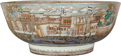 海纳百川、兼容并蓄的广彩匠师,对于一切能够引发市场反响的风格和技法,都不吝于大胆尝试。在琳琅满目的广彩制品中,有一类产品非常特别,称为“行碗”,现又称为“皮碗”,也有人以英文音译称其为“潘趣碗”。这是因为洋人常要求艺师在碗身画上他们与中国人做买卖的地方——十三行的景色,去满足国外消费者的好奇心。这种巨型大碗,有些直径甚至达50多厘米,胎薄釉润,图案繁复精美,是广彩外销瓷中的珍品。