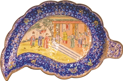 珐琅彩料和配制技术约于康熙晚期从欧洲传入广州后,创造了广彩独特的自有颜料。图为铜胎画珐琅罩透明釉开光人物纹叶形碟。